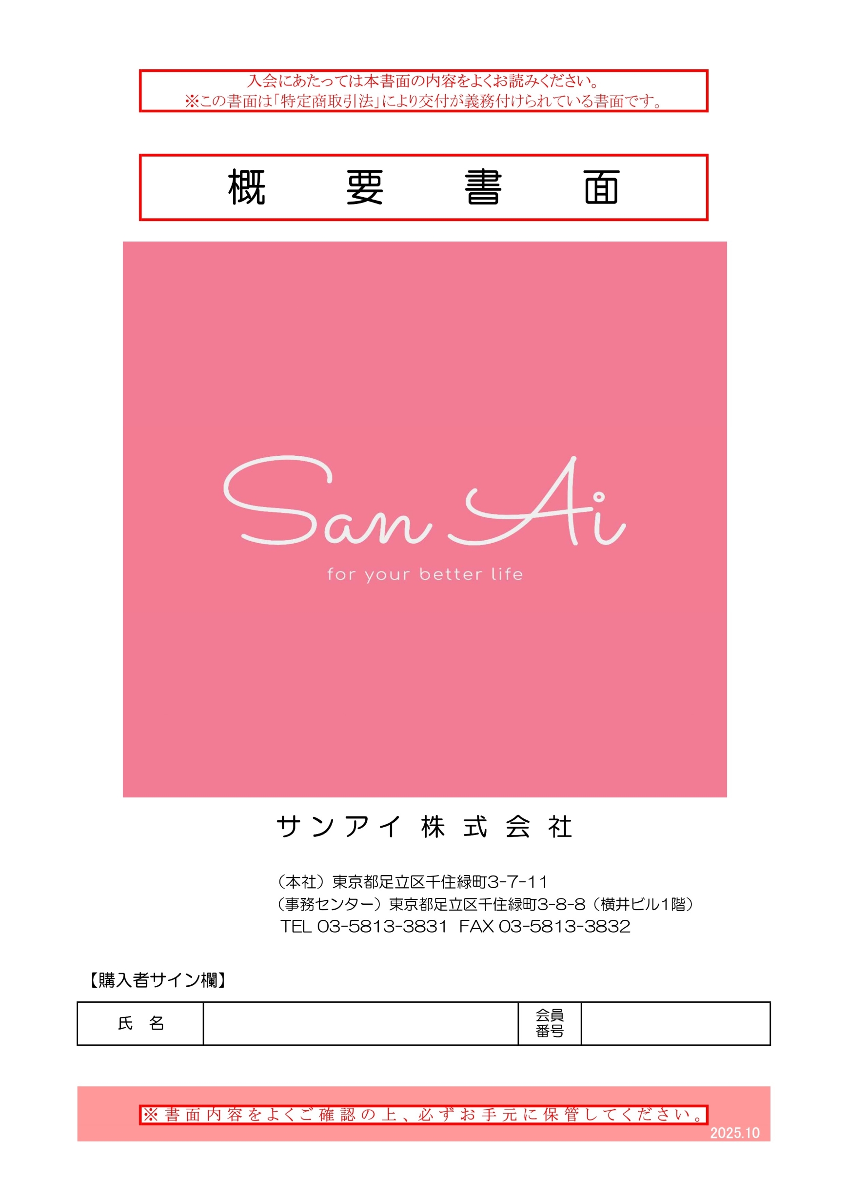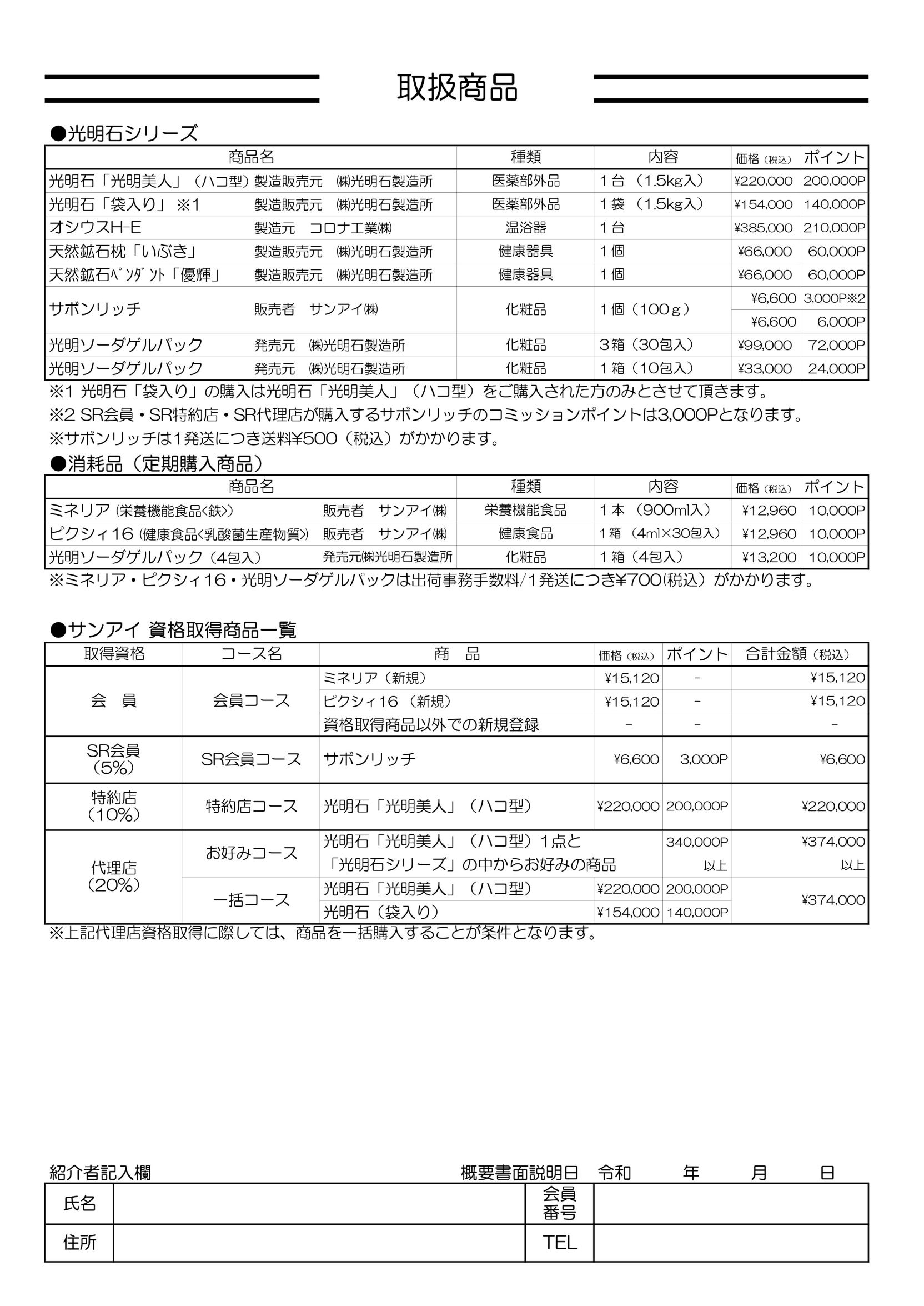 このフォームでサンアイ特約店・代理店登録を行えます。(光明石の購入が初めて方用のフォームです。耐久品の資格を既にお持ちの方の自己購入にはご利用いただけません。)登録にはご紹介者(会員・特約店・代理店・販社)が必要です。ご紹介者様と「概要書面」をお読みいただきご入力ください。サンアイ特約店・代理店登録をすると資格に応じた自己売上ポイントの販売手数料を受取る権利を有します。登録はご入金が確認された段階で完了となります。登録完了後にサンアイ株式会社から登録完了の書類が送付されます。