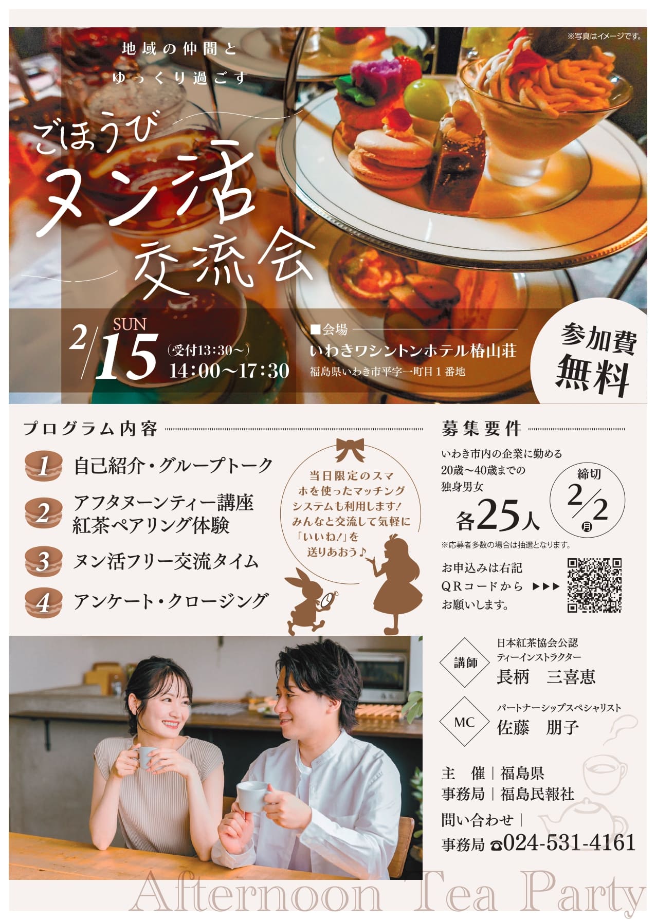 本イベントへの参加をご検討いただきありがとうございます!以下の内容をご入力いただき、参加申込をお願いします。ぜひ、この機会に地域で働く同世代の仲間達とつながりましょう!【イベント概要】地域の仲間とゆっくり過ごす ごほうびヌン活交流会 申込フォーム日時:2026年2月15日(日)午後2時~午後5時30分(受付午後1時30分~開始)場所:いわきワシントンホテル椿山荘参加料:無料参加対象者:いわき地域に事業所を置く企業に勤める20~40歳の独身男女各25名※応募者多数の場合は抽選とさせていただきます。