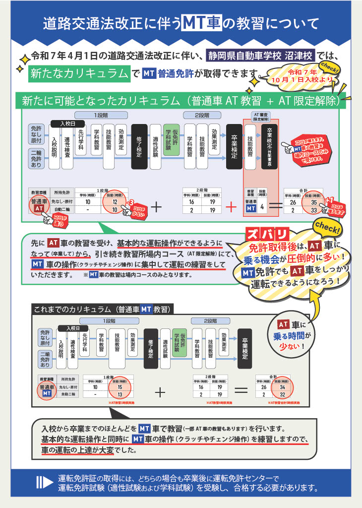 「普通MTの教習車の運転」はAT卒業検定合格後に「場内で最短4時限」と「場内検定」時のみで普通MT免許が取得可能となりました。(MT車での路上教習・検定なし)