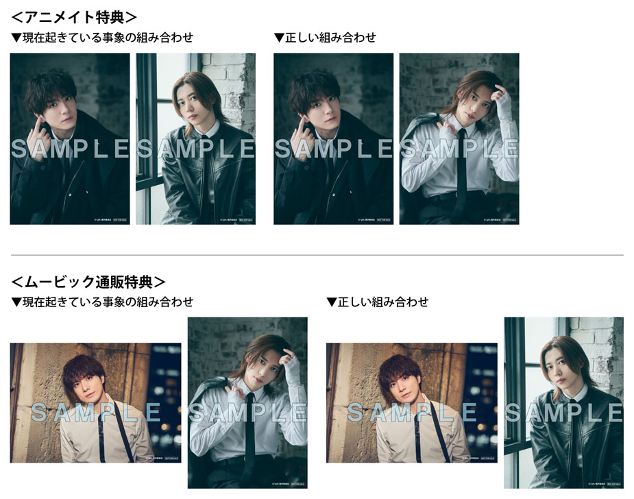 アニメイト特典「秋葉浩太&夏目 奏 L判ソロブロマイド2枚セット」につきまして、「夏目 奏」の柄がムービック通販特典「秋葉浩太&夏目 奏 L判ソロブロマイド2枚セット」の「夏目 奏」の柄でセットされている事態が発生いたしました。