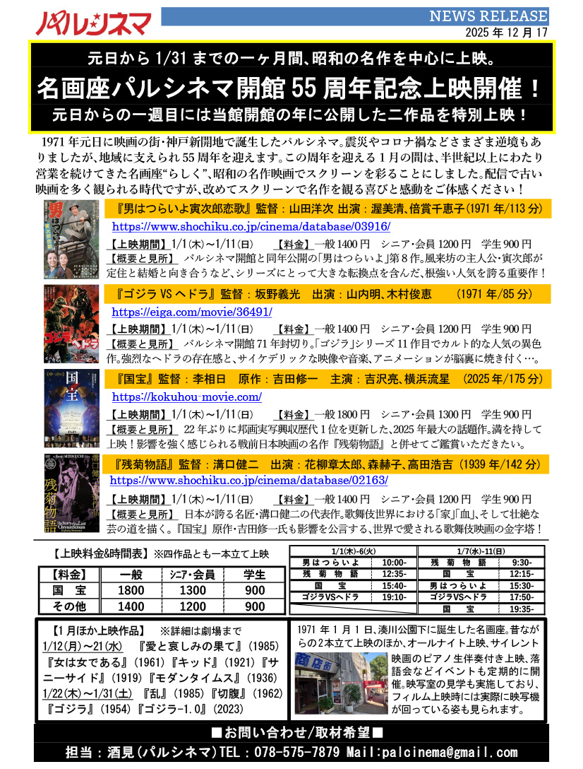 毎月第4水曜日18:00~(みきらぢサンナナ内)「名画座に誘われて~パルシネマ映画通信~」神戸新開地にある映画館 「パルシネマしんこうえん」よりスタッフさんに登場していただき現在公開中の映画、近々公開される作品の紹介など、映画の魅力をたっぷりお聞きするコーナーです。そのコーナーから、パルシネマで使用できるチケットを2組4名様にプレゼント♪使用期間内に上映されている映画の鑑賞チケットです。◆ご希望の方は 住所・氏名を明記の上、下記の応募フォームもしくは エフエムみっきぃメールアドレス melbo@fm-miki.jp までご応募ください。応募しめきり:12月31日(水) 必着今回のおすすめパルシネマはこの1月1日で55周年となります。名画座として営業を続けてきた当館”らしい”ラインナップをご紹介します。