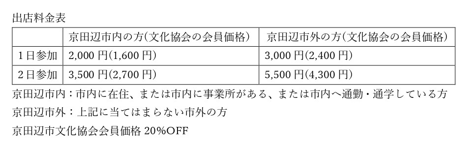 「つくろう!ふるさと京田辺」Vol.23 春の音楽祭inブランチ松井山手一般社団法人京田辺市文化協会が主催するイベントです。京田辺市を中心に活躍する演奏団体や演奏家による音楽祭とともに会場に多彩なマルシェ&ワークショップが出店されます。5月9日(土)5月10日(日)午前11時~午後4時各日5組のステージを予定しています。マルシェの出店はこの時間内で自由にご出店下さい。・屋根付きテント・販売台(長机)と棚1つ以上は10:00までに文化協会がご用意いたします。10:00受付開始。本部にて必要書類を受け取ってください。その後設営を開始してください。当フォームにて出店申込↓出店許可連絡↓出店料お振込み↓配置決定連絡↓当日10時より受付後設営開始↓11時より販売開始