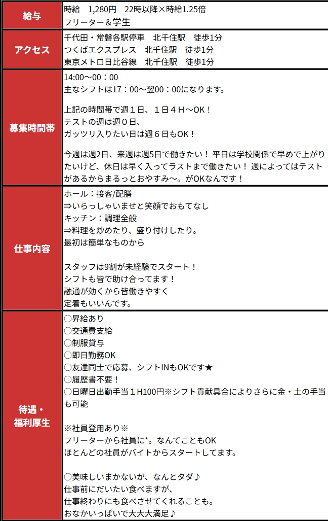 交通費有、扶養控除内、昇給あり、22時以降深夜手当履歴書不要、金・土1H100円手当、まかない無料