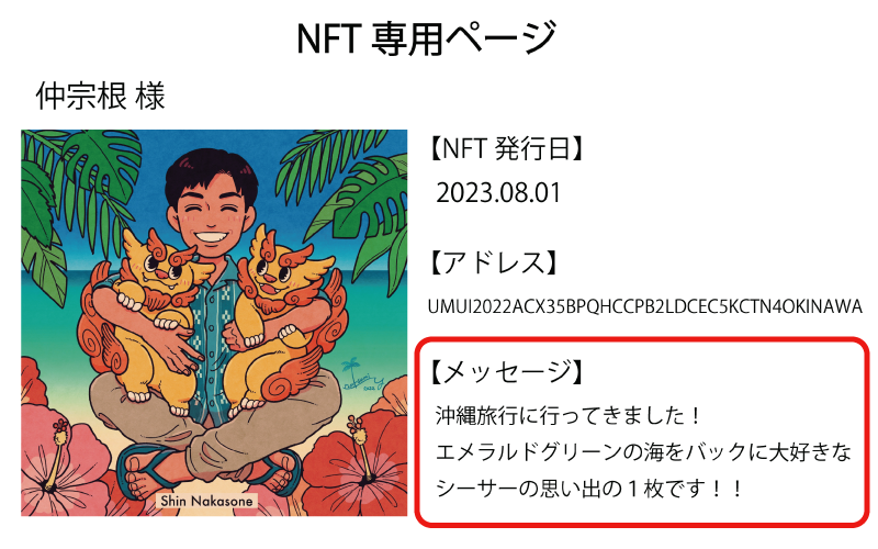 NFTを発行する際に、メッセージを記載することができます。大切な思い出にメッセージを添えることで、より鮮明にお客様の記憶にアクセスし蘇ることでしょう。撮影日時や場所なども添えるといいですね!
