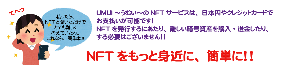 UMUI~うむい~NFTサービスへのお申込みにアクセスして頂きまして、誠にありがとうございます。お客様が、サービスをご利用される際の、お名前やメールアドレスなどの必要事項のご入力フォームになります。詳細事項やご注意点などをお読みになりご入力ください。ご入力完了及び送信後、3営業日以内にご返信致します。
