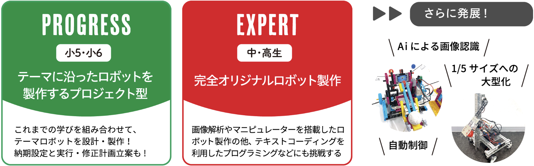 試合に勝つという目的を持ち、ロボットやプログラム、戦略の工夫を行います。場面に応じて、プログラムを臨機応変に変更したり、先の状況を見据えて行動するという、社会に出た時に必要な力の基盤をつくります。