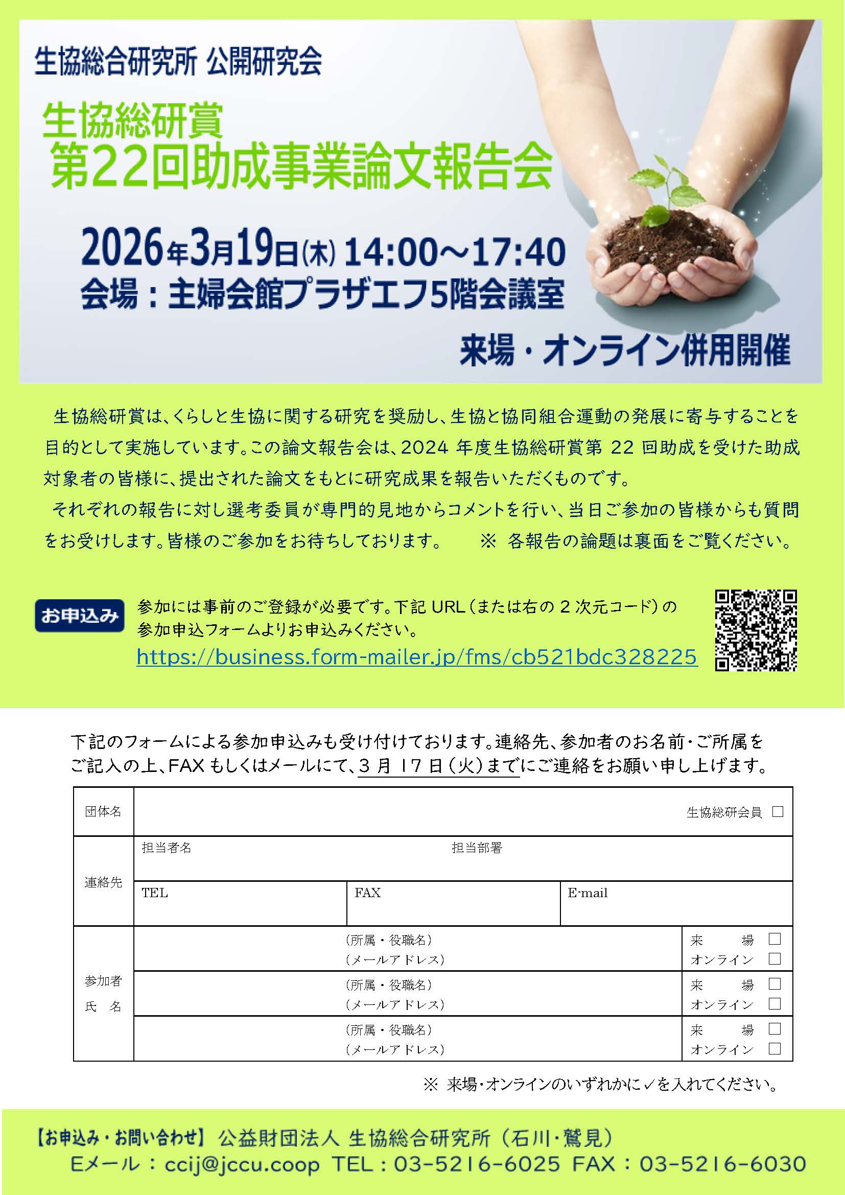 ※ 申込後に自動送信の受付メールが届かない場合は、アドレスに誤りがある恐れがありますので、生協総研(ccij@jccu.coop)までご連絡ください。