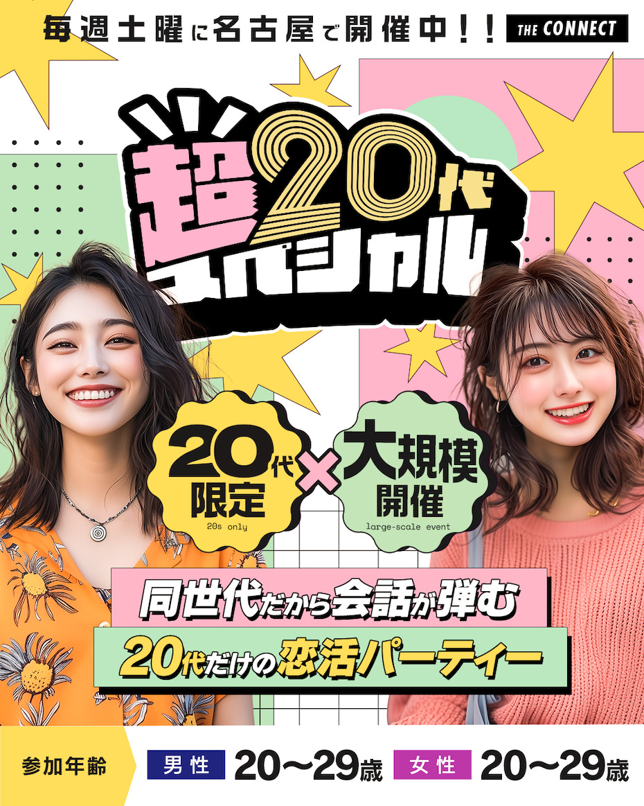 16:00 ~ | イベント終了 イベント終了後はお気に入りの異性を誘って二次会も楽しんできてくださいね。まだまだ出会いが足りない!という方は夜に開催される夜の超20代にも参加しちゃいましょう♡ |