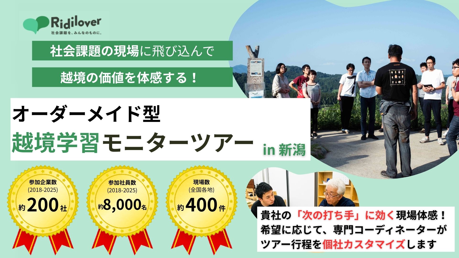 | 15:30-16:30 | ラップアップ | モニターツアーのご感想を踏まえて、豊富な現場研修実績のあるリディラバ担当者から実例を紹介しつつ、ご要望に合わせたプランニングなどをディスカッションなど (これまでにご紹介した各要素が、具体的に企業研修としてどのような反響・効果をもたらすか) |