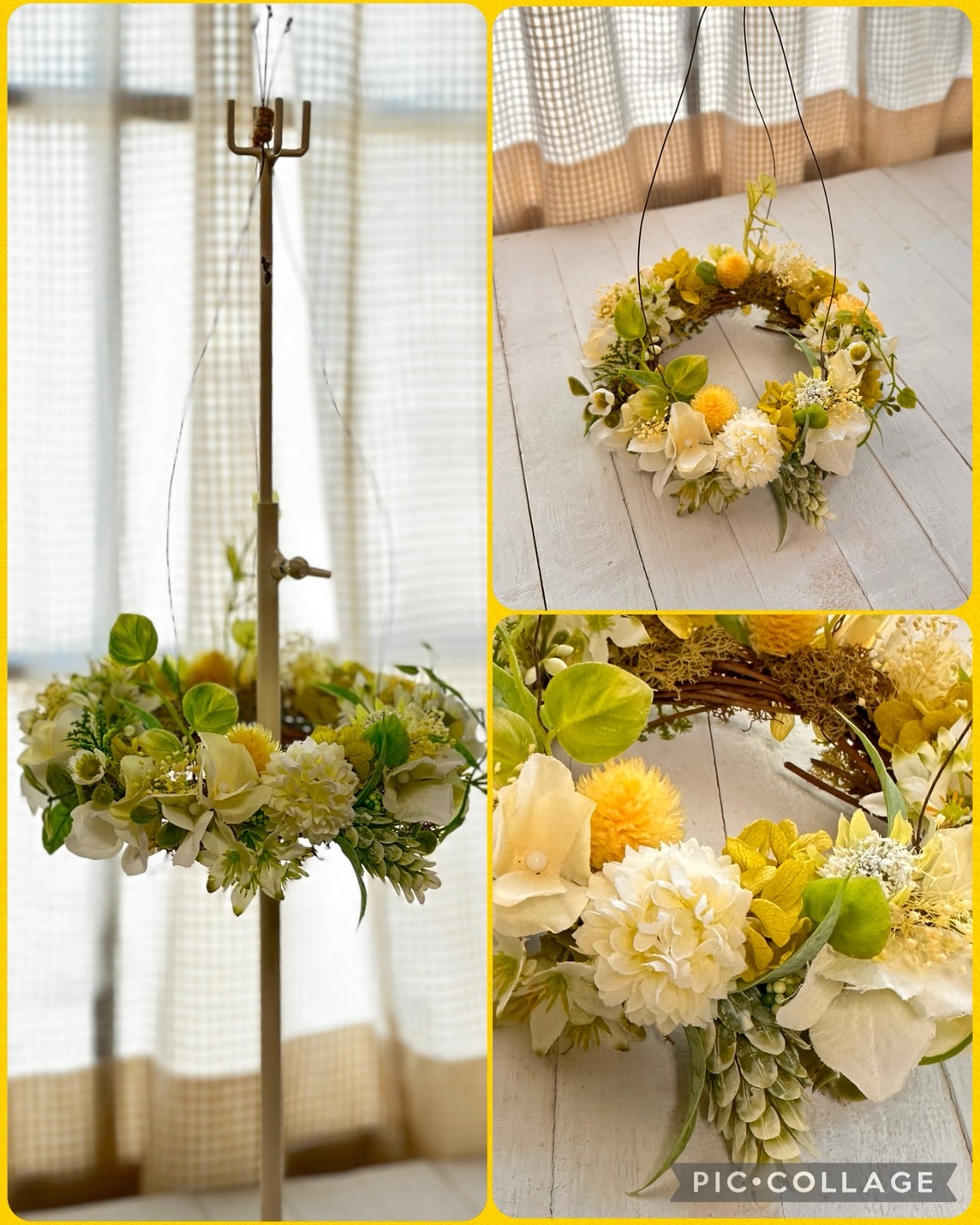 アーティフィシャルフラワーとプリザーブドフラワーを使って、吊り下げ(宙に浮く)タイプのリースを作ります。リース作りが初めての方も気軽にご参加ください。