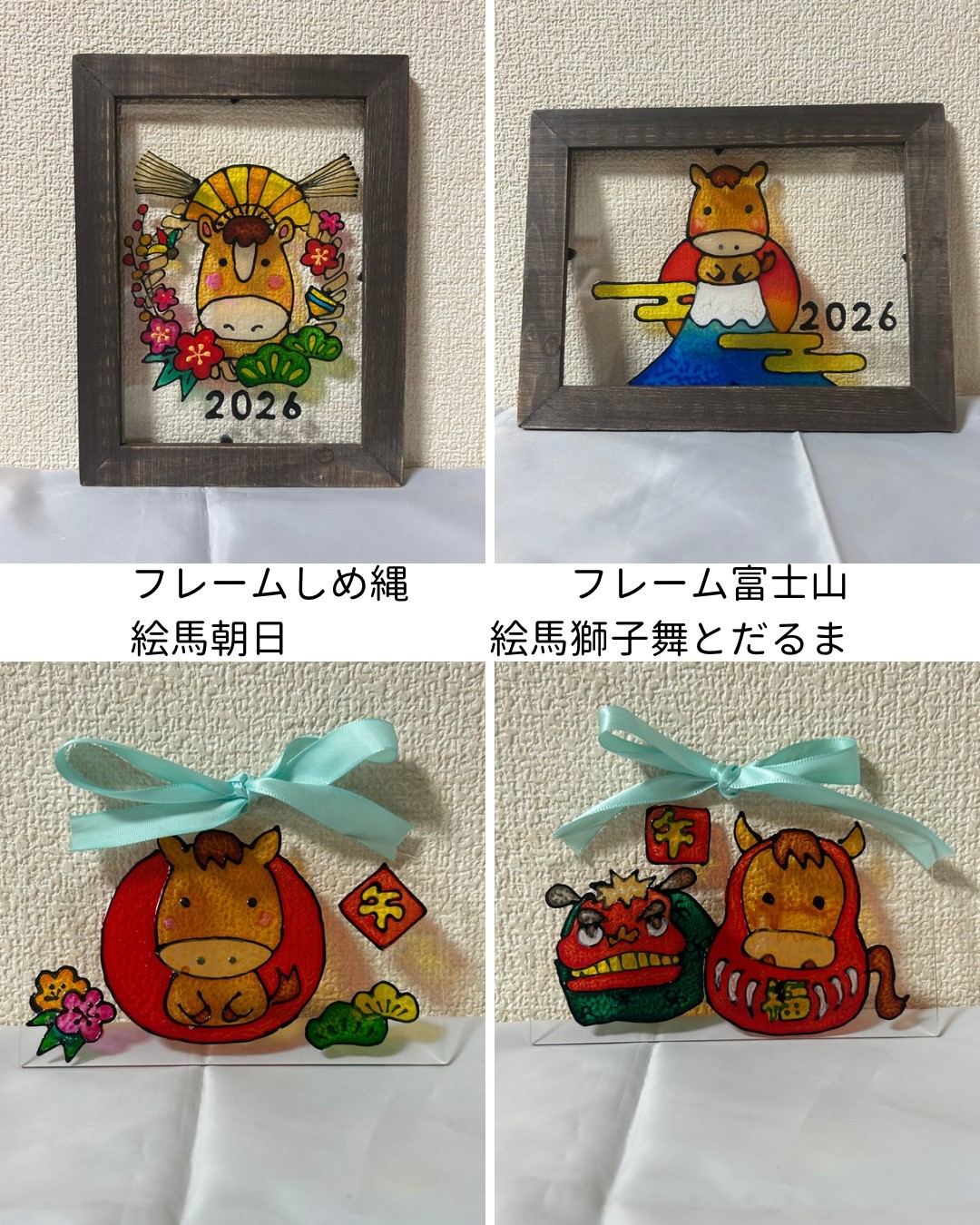 【フレームしめ縄・フレーム富士山・絵馬朝日・絵馬獅子舞とだるま】の中から1点お選びください。
