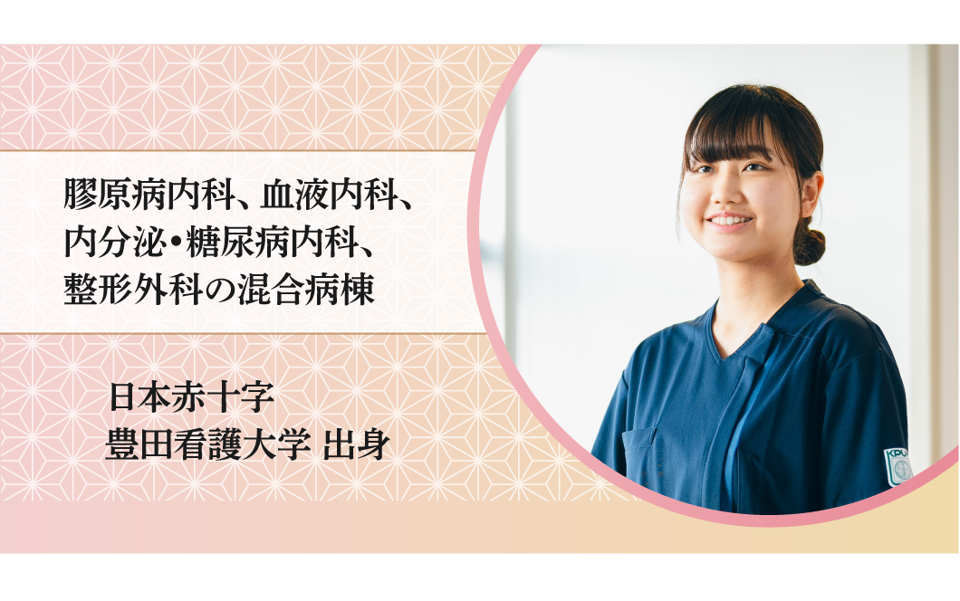 ストーマ管理やドレーンケア、経腸栄養の管理、術前の化学療法など消化器外科特有の専門的なケアに携わり、看護師としてのスキルアップができる病棟だと思います。病棟編成のため、病棟異動があり、3か月経ちましたが、毎日学ぶことが多く、忙しい中でも新しい看護技術や知識を身につけることが出来ていると実感しています。