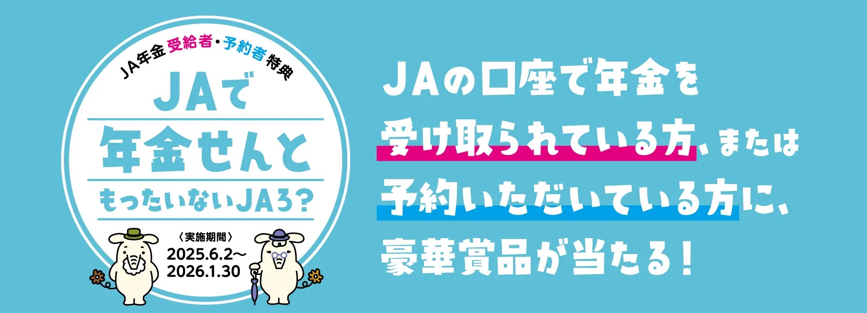 ●注意事項:65歳以上の方でJAバンクアプリプラスから送金等の機能をご利用される場合は、JA窓口までお問合せください。各賞については重複当選いたしません。懸賞品は一時所得と考えられ、確定申告が必要な場合がございます。詳しく税理士等の専門家にご相談ください。住所不明、転居先不明、長期不在、日本国外の配送先指定などにより景品をお届けできない場合には当選を無効とさせていただく場合がございます。