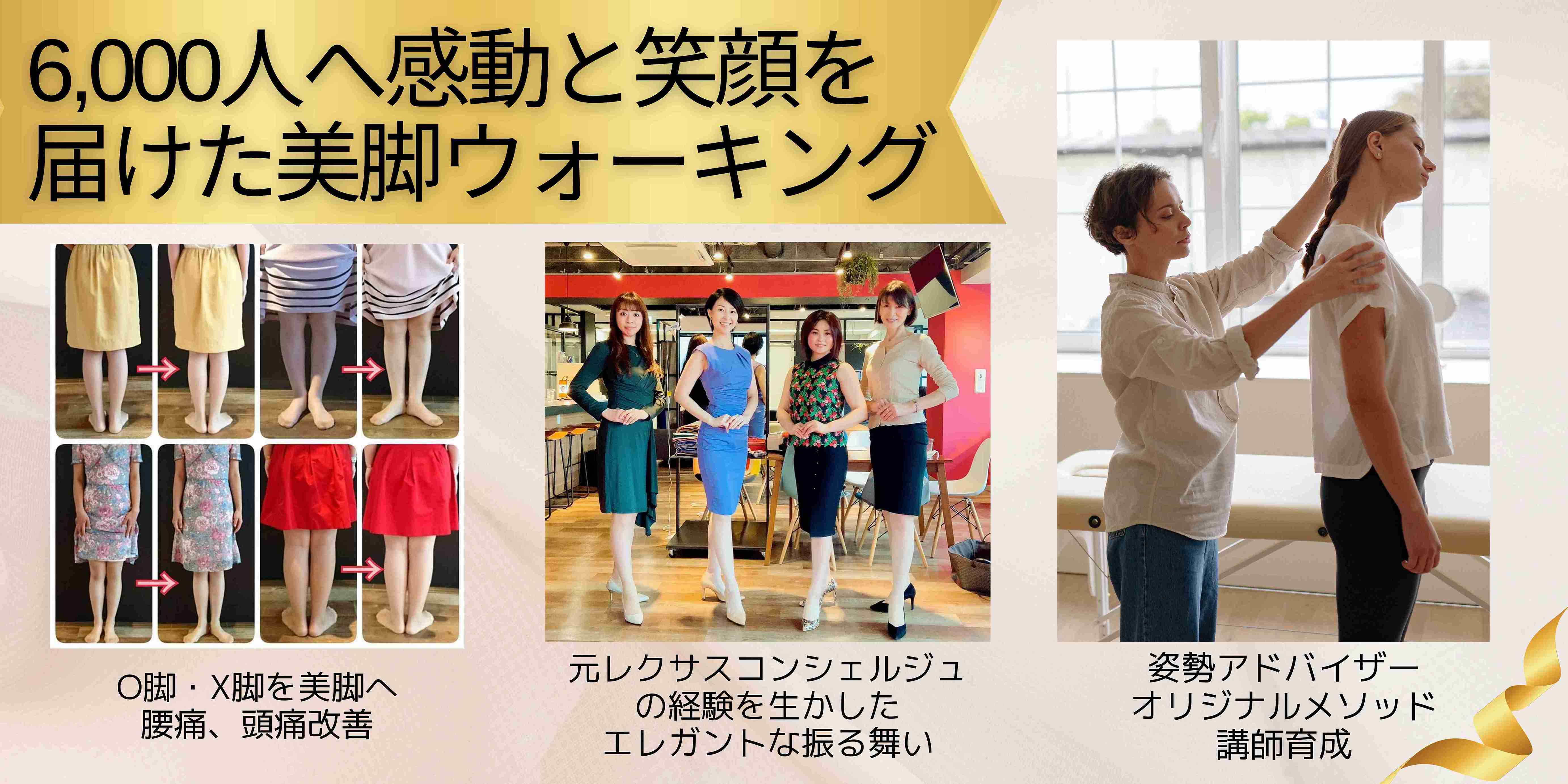 私は、生れつき側弯症に悩まされ、腰痛や頭痛を改善するために体に負担をかけず、歩けば歩くほど綺麗になる美脚ウォーキングメソッドを開発しました。ポイントは、硬く、太く、疲れない、しなやかな内側の筋肉を日常の歩き方で育てること! やるべき事は今までの姿勢や歩き方の常識をアップデートする事。新感覚のレッスンは目から鱗でした×1000名以上。ぜひ貴方も体験レッスンに参加してみませんか?名古屋スタジオ・オンラインでも受講可能です!下記よりお申込みお待ちしてます。