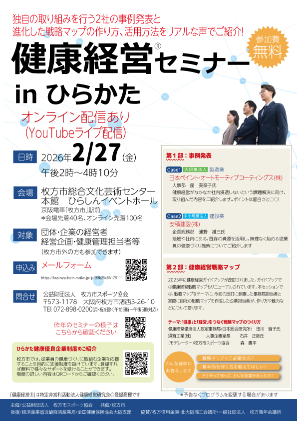 | 午後3時10分~ | 「健康」と「経営」をつなぐ戦略マップのつくり方 2025年に健康経営ガイドブックが改訂されました。ガイドブックで は健康経営戦略マップもリニューアルされています。本セッションで は、戦略マップをテーマに、今回の改訂に参画した事務局担当者と 実際に自社の戦略マップを作成した企業担当者が、作り方や魅力な どについて語ります。 (出演) 健康経営優良法人認定事務局 健康経営ガイドブック改訂担当(日本総合研究所) 田川 絢子氏 須賀工業(株) 人事企画室長 石井 正彦氏 (モデレーター)枚方市スポーツ協会 森 貴平 |