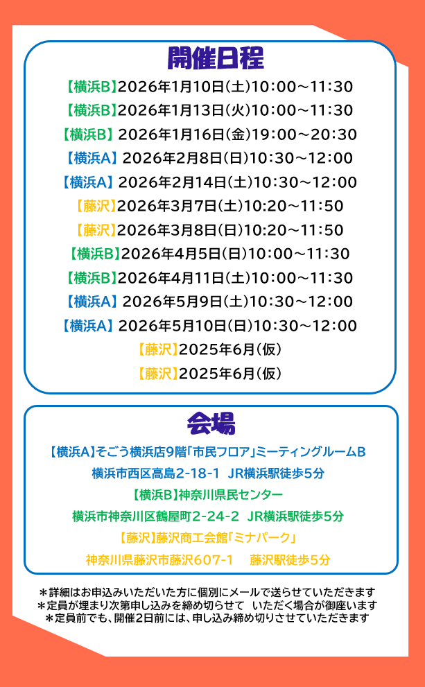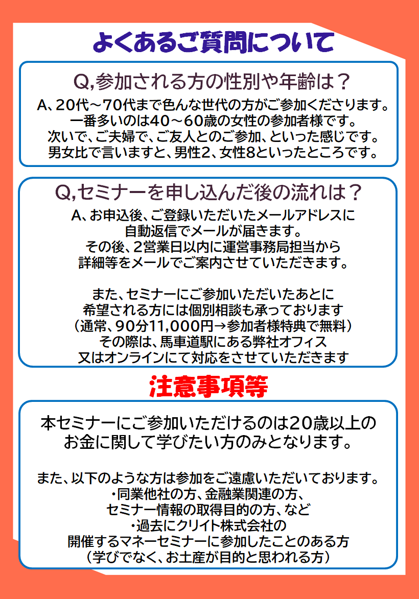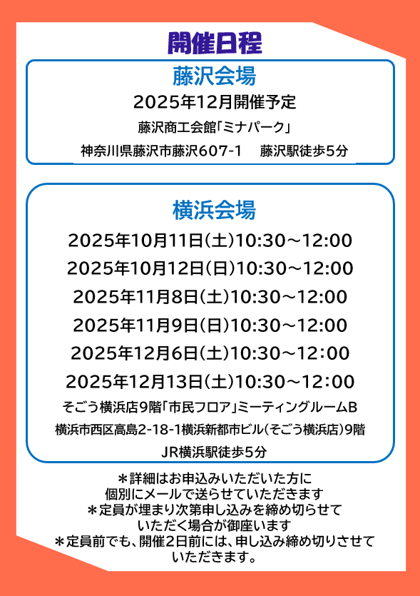 (多くの方にご参加いただけるよう、無料セミナーの受講はお一人様1回限りとさせております。)