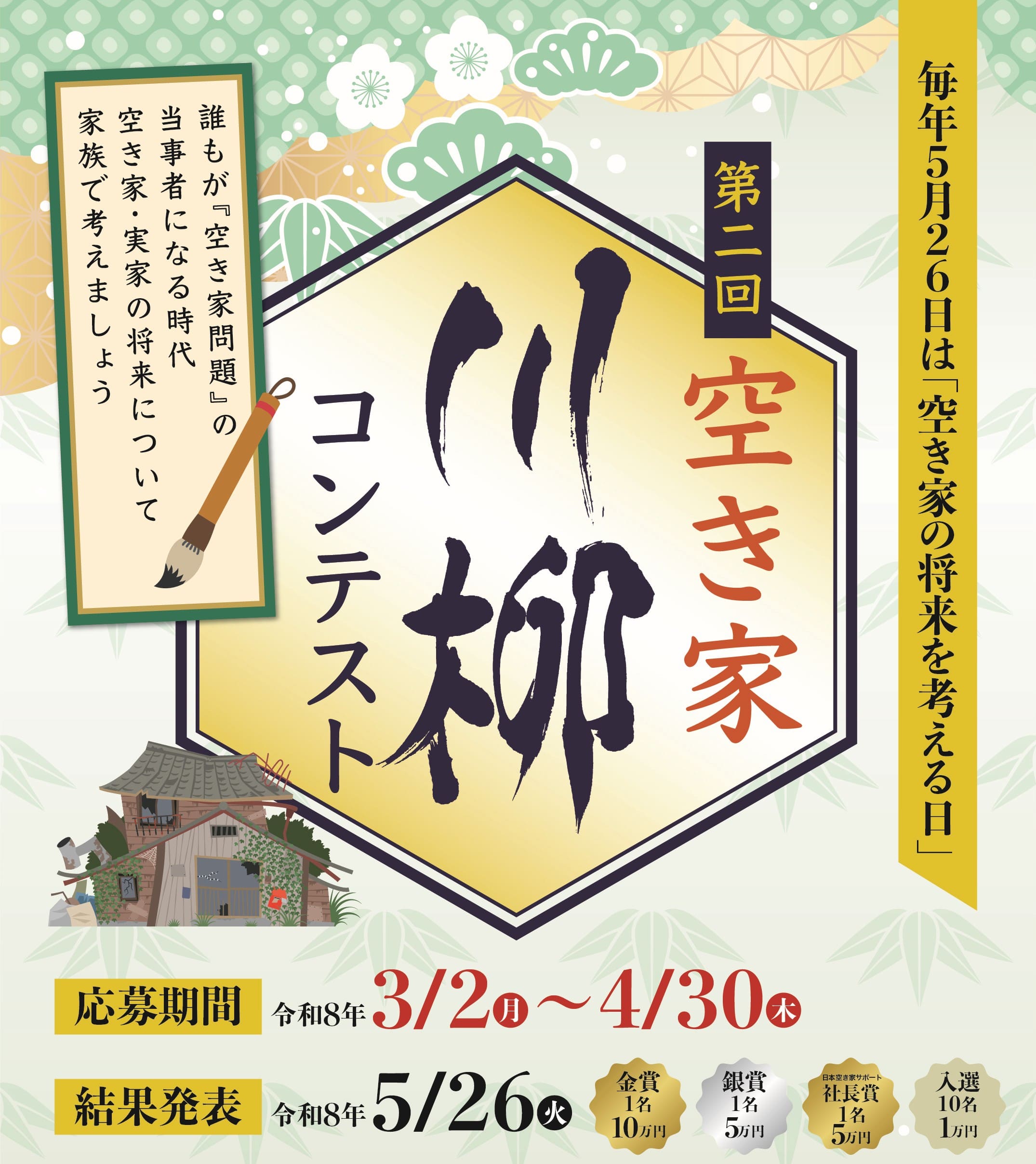 | スケジュール | 2026年3月 2日(月)10時00分 募集要項発表、登録・作品提出開始 2026年4月30日(木)23時59分 登録・作品提出締切 2026年5月26日(火)10時00分 日本空き家サポートホームページ・PRTIMESにて発表いたします。 |