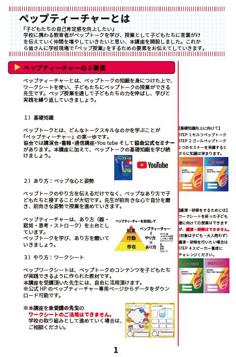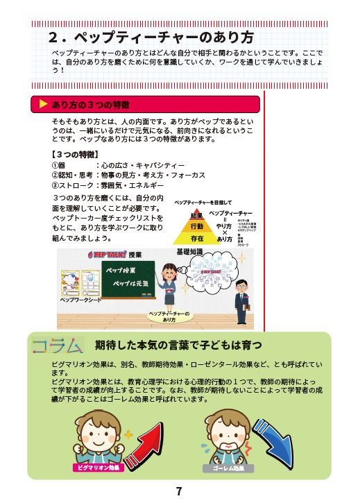 ペップティーチャーとは、ペップトークの基礎知識を学び、PEPワークシートを使ってペップトークのスキルを活用してコミュニケーションの授業を展開する先生のことです。