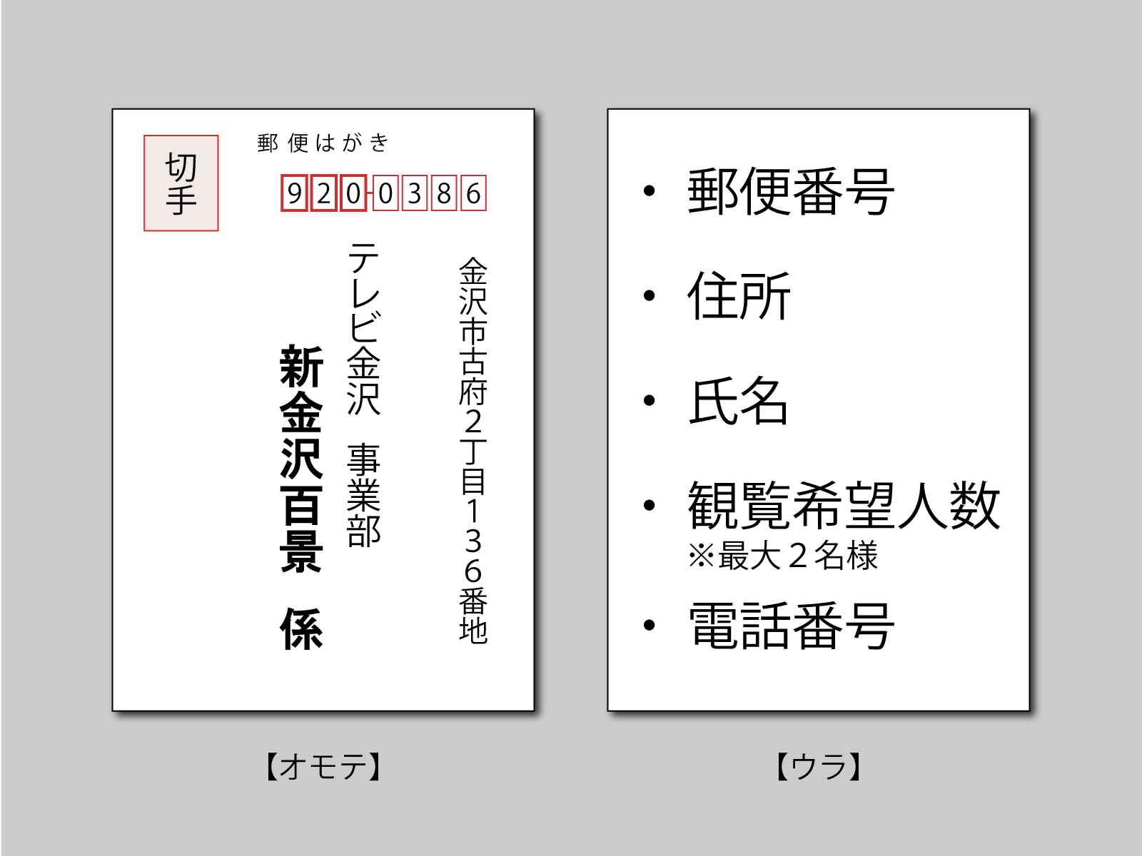 【 日 時 】 3月19日(木)16:00 開演(予定) (15:15開場)ご観覧をご希望の方は、郵便番号、住所、お名前、観覧希望人数、電話番号をご記入の上、テレビ金沢HP、テレ金ちゃんアプリ、又はおハガキにて『新金沢百景イベント』係までお申し込みください。