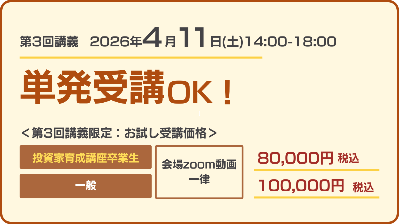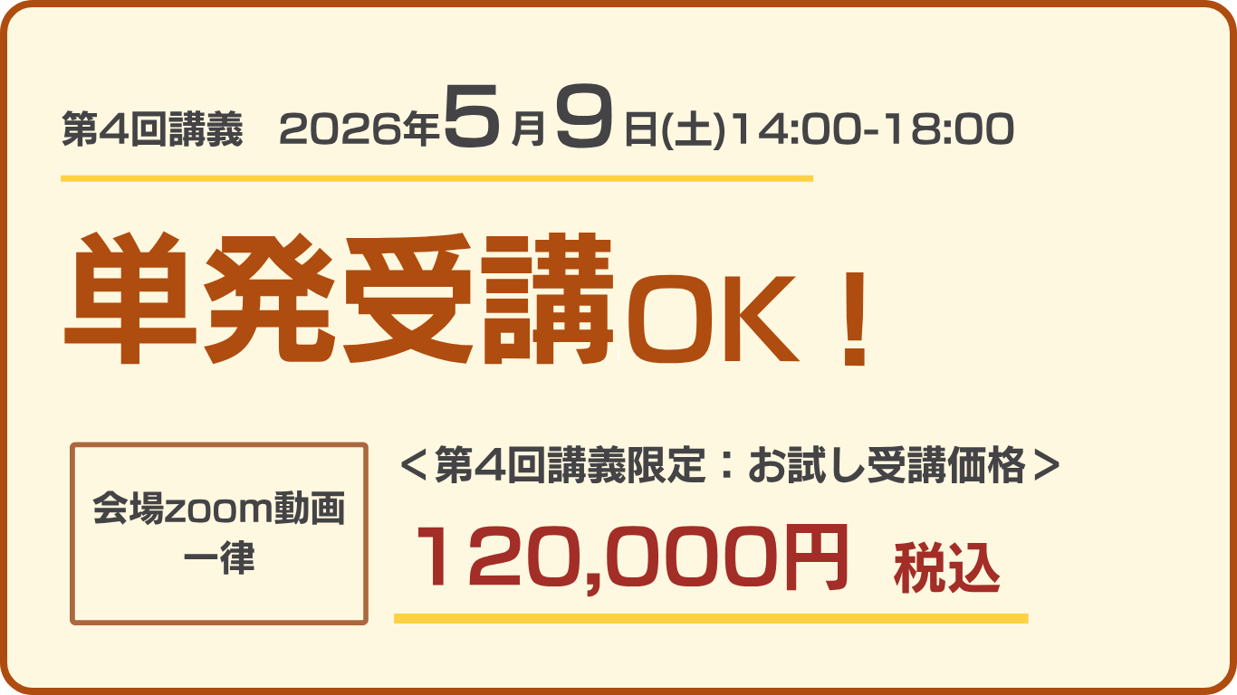 | 受講プラン | ①会場・zoom受講プラン:100万円(税込) ②動画受講プラン:90万円(税込) ③4月11日限定単発受講:8~10万円(税込) |