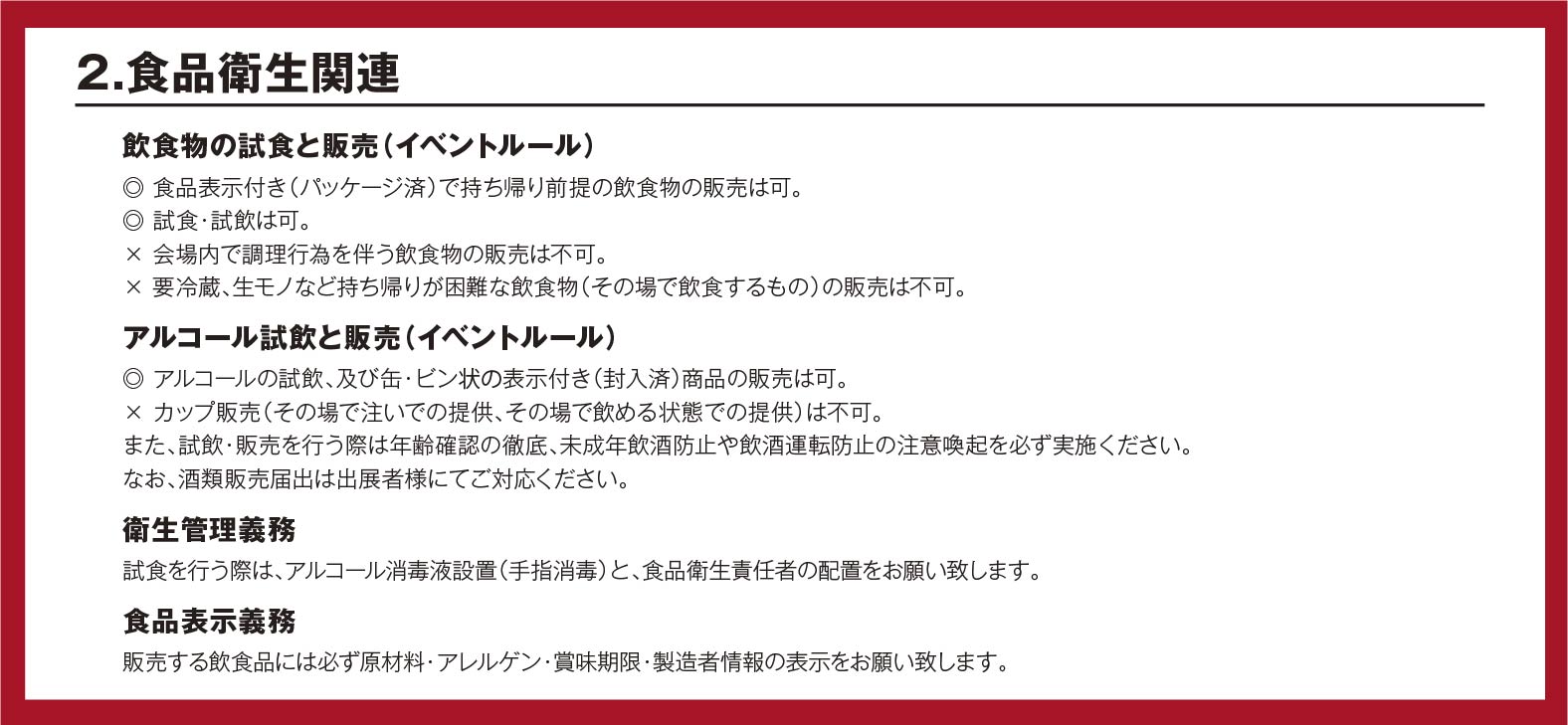 ・催事中、ブース内で宴会行為、喫煙、飲酒しながらの販売行為はやめてください。