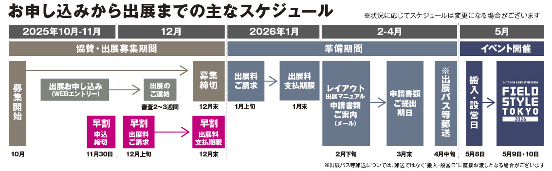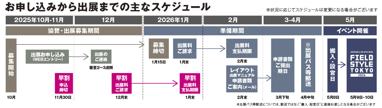・開催1ヶ月前付近に出展マニュアルをご案内します。同時に申請書類提出の依頼をしますので、必ず期日までに提出してください。