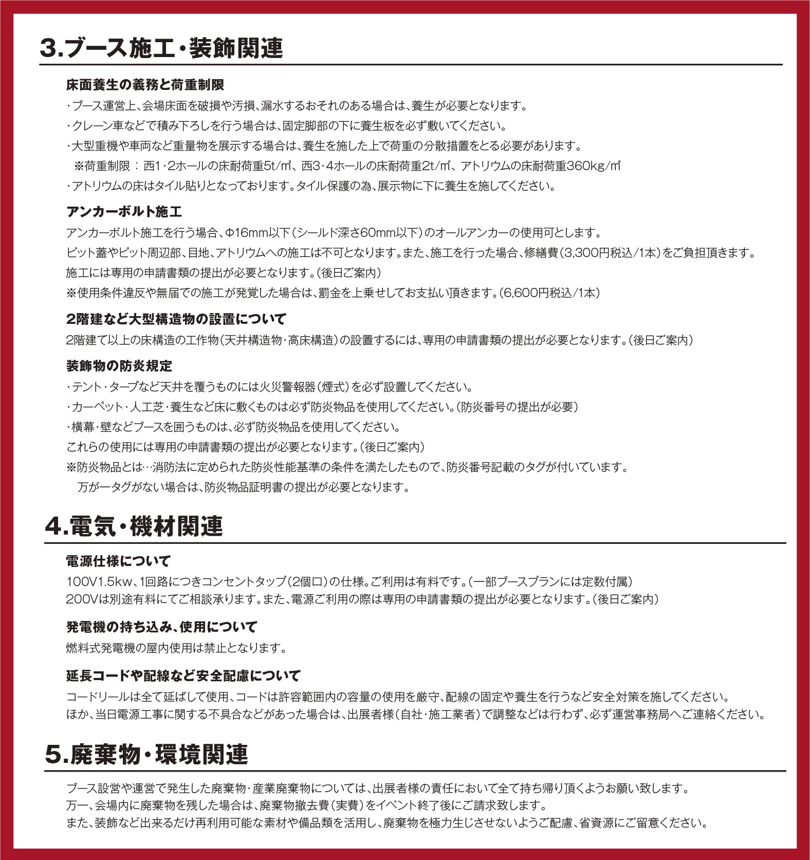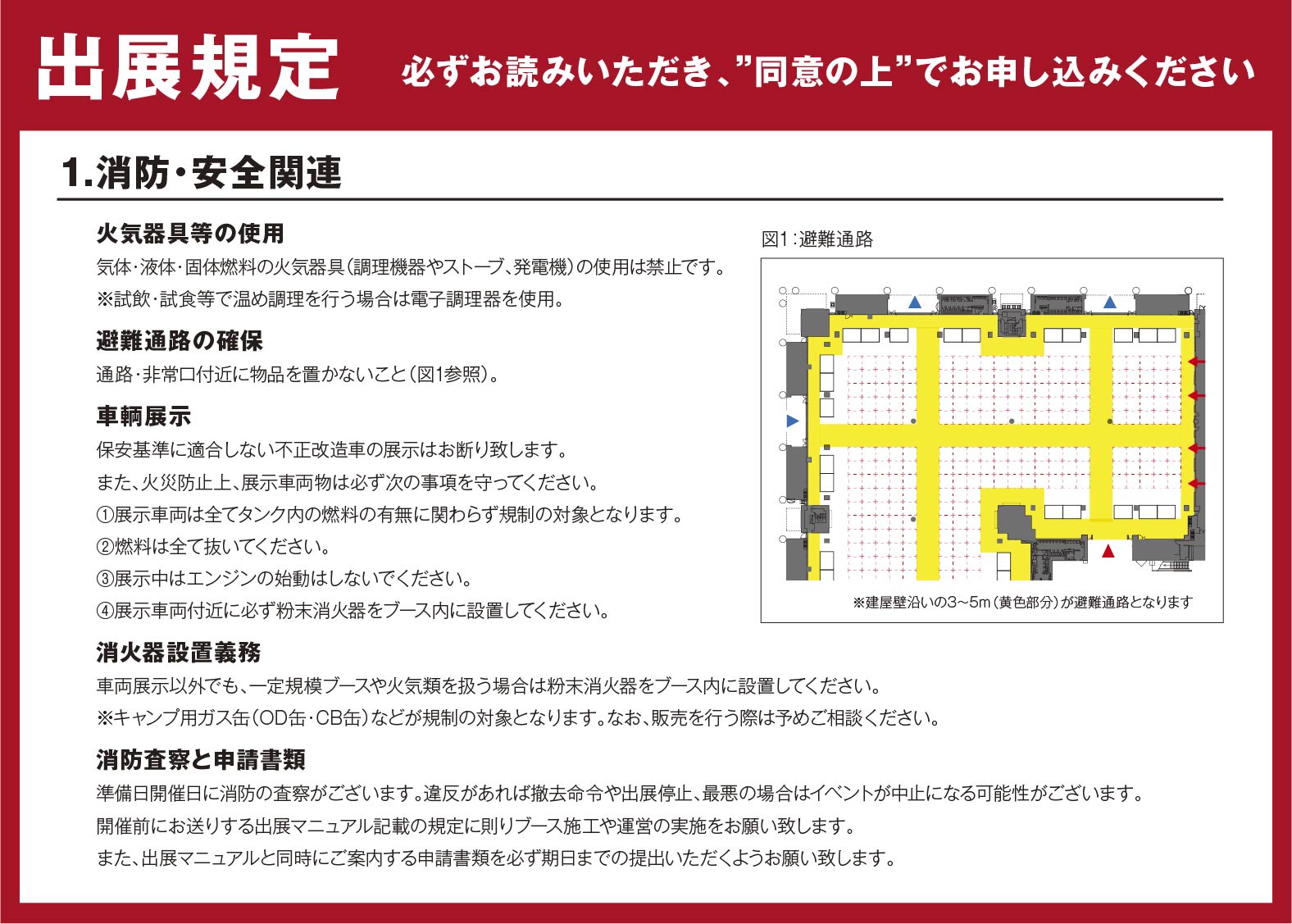 ・出展者は十分な安全策を講じ、災害防止に万全を期さなければなりません。