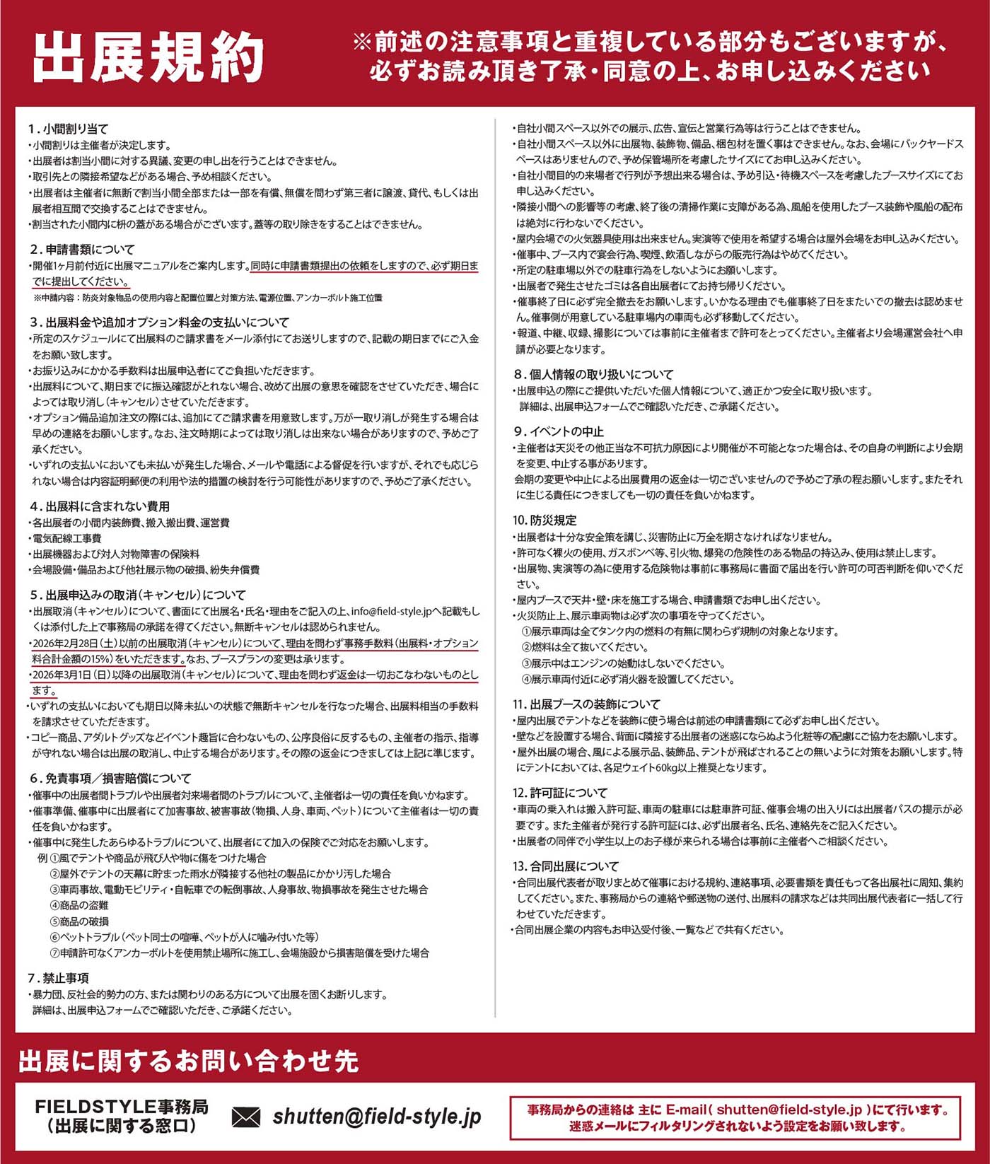 5. Cancellation of Exhibition Application- To cancel, submit the exhibitor name and reason in writing to shutten@field-style.jp and obtain approval from the secretariat. Unauthorized cancellations will not be accepted.