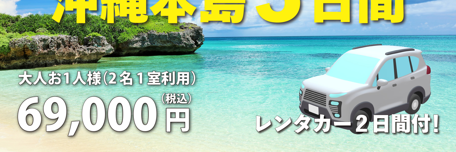 | 2日目 | ホテルで朝食後、那覇市内レンタカー営業所(18:00)まで <モデルコース>ジャングリア沖縄→美ら海水族館など 那覇[泊]:メルキュール那覇沖縄 | 朝 |