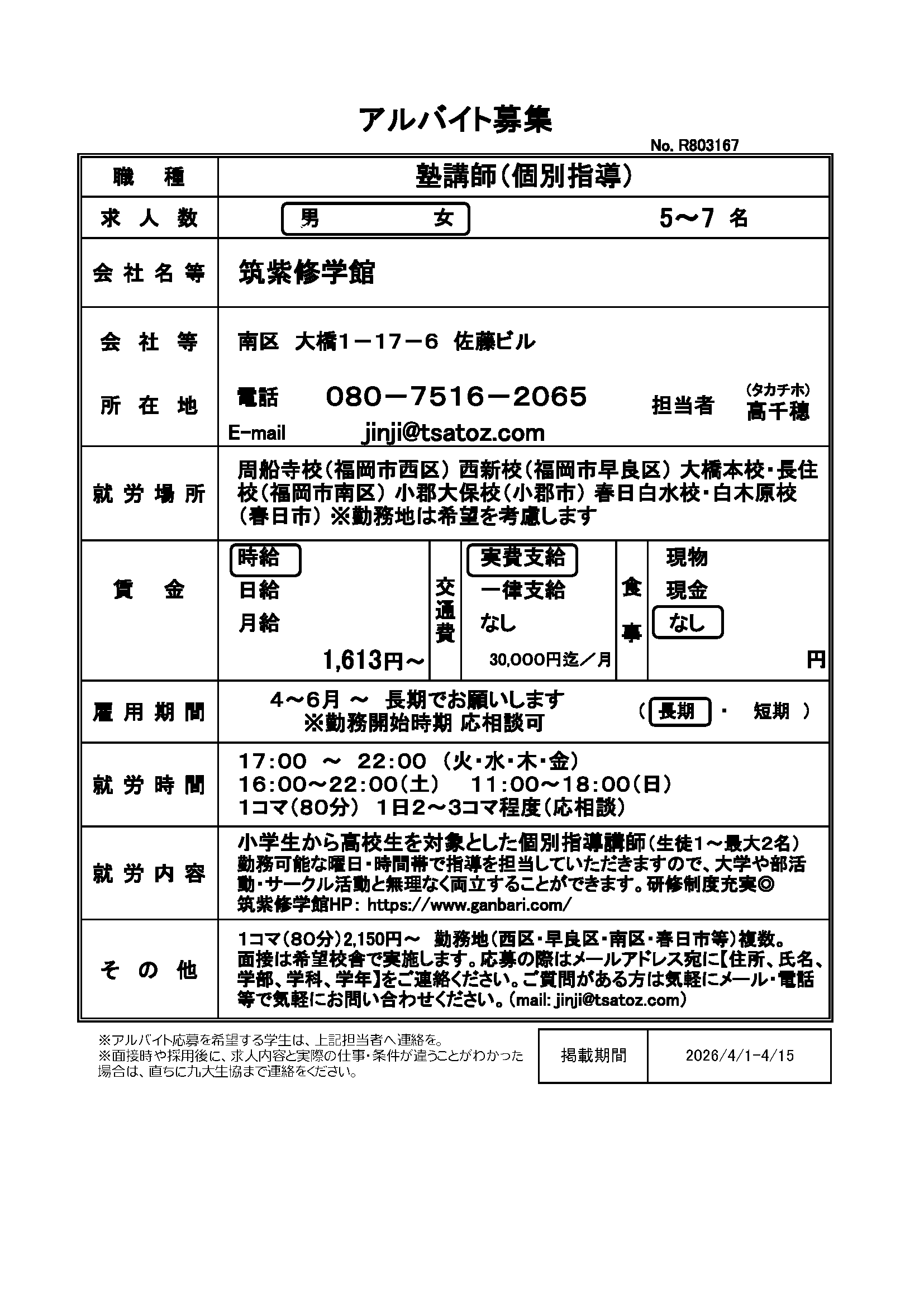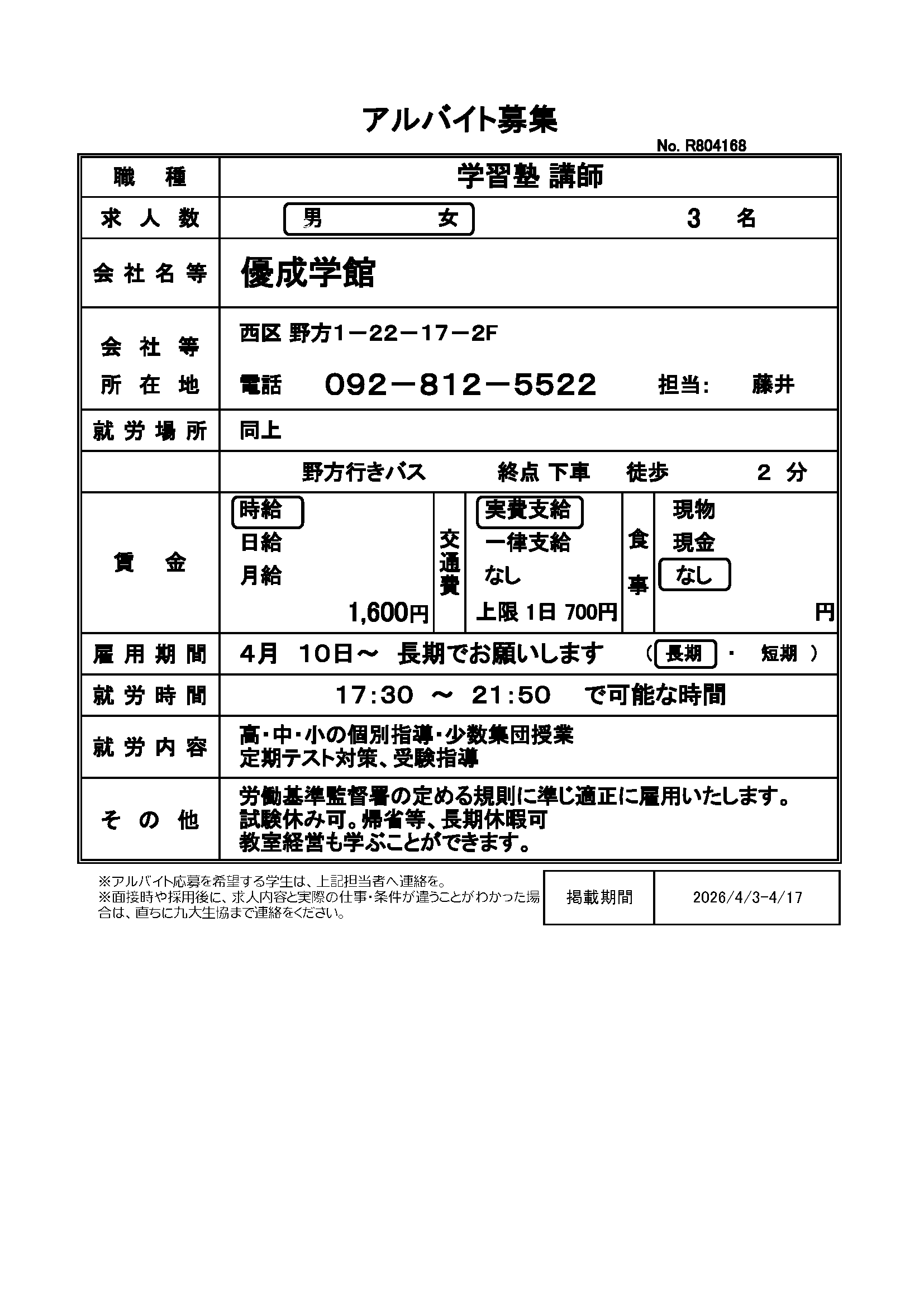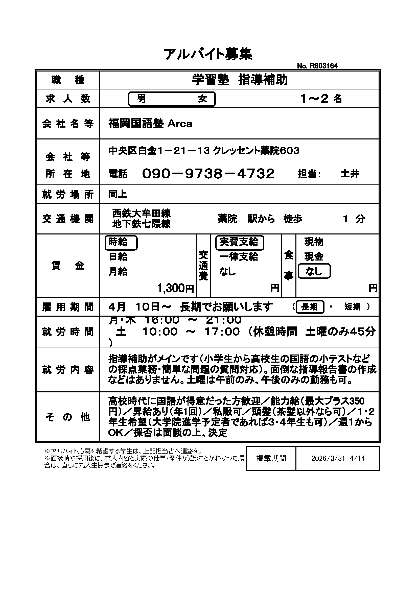 | R803166 | 【長期】学習塾 | 4月1日~長期でお願いします | 2026.4.1 |