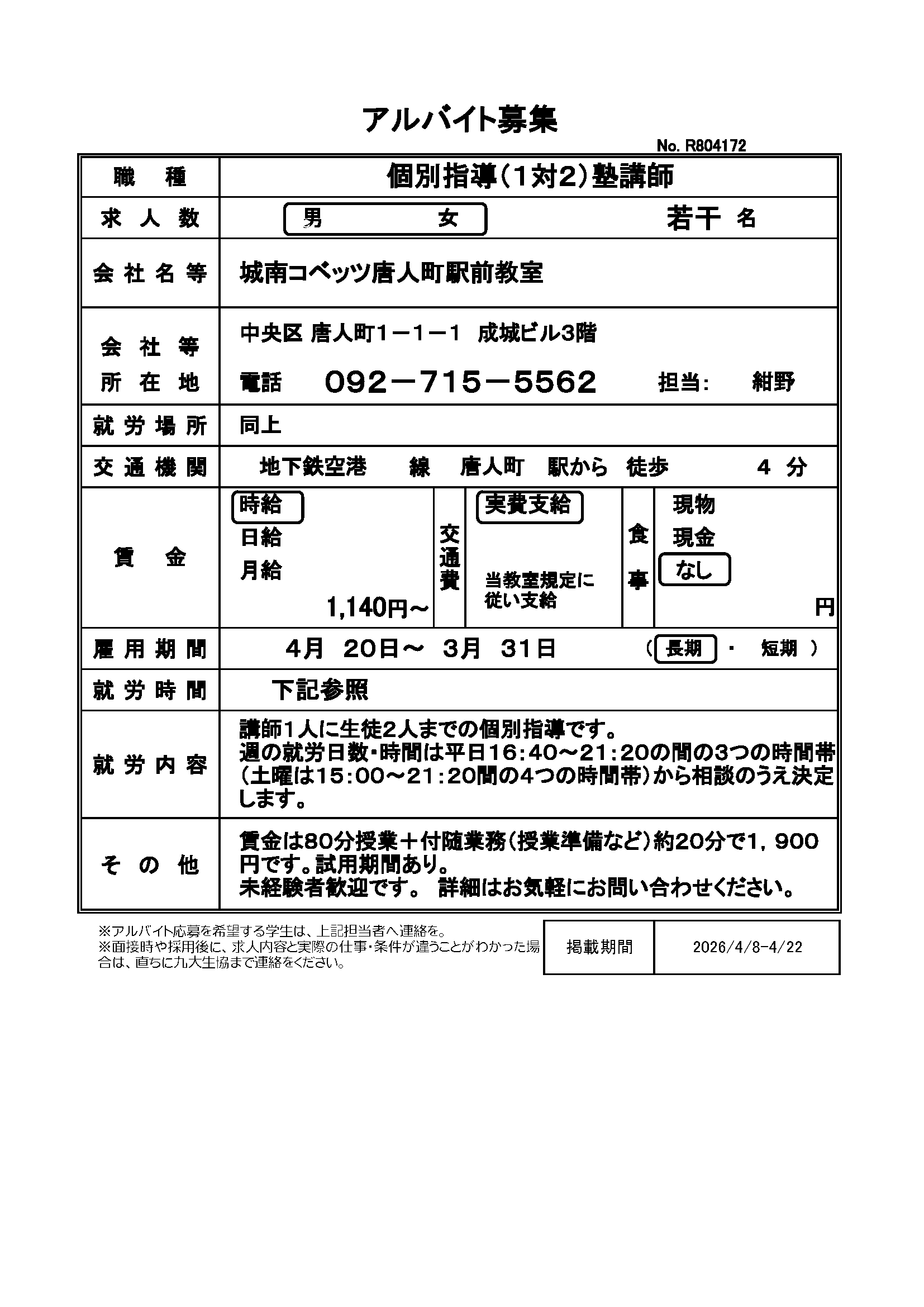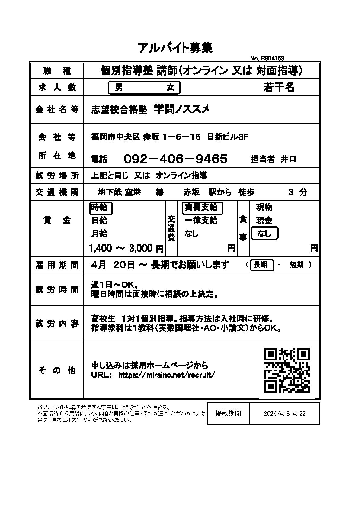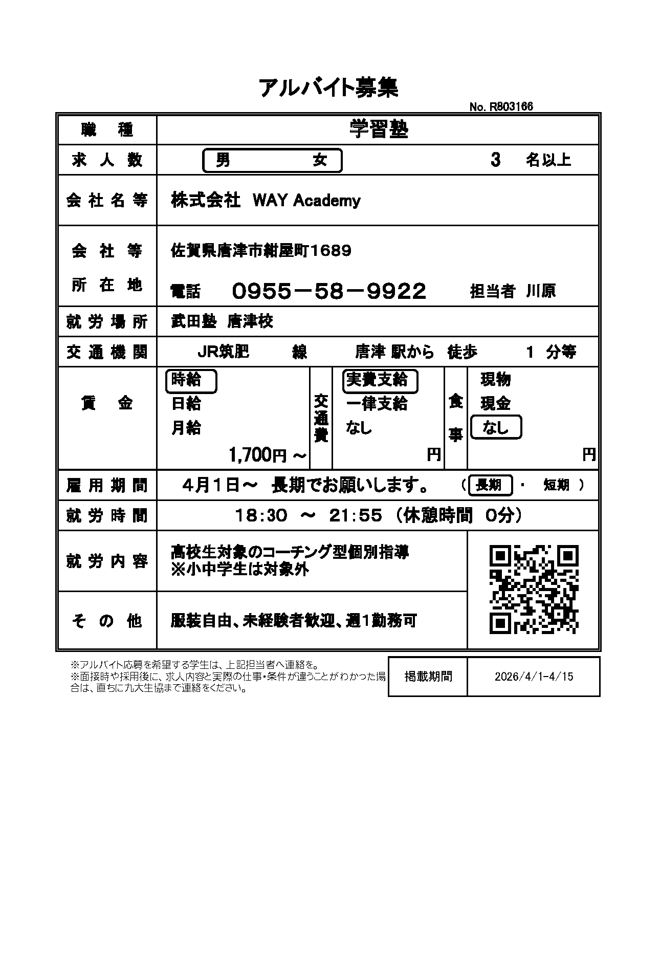 | R803166 | 【長期】学習塾 | 4月1日~長期でお願いします | 2026.4.1 |