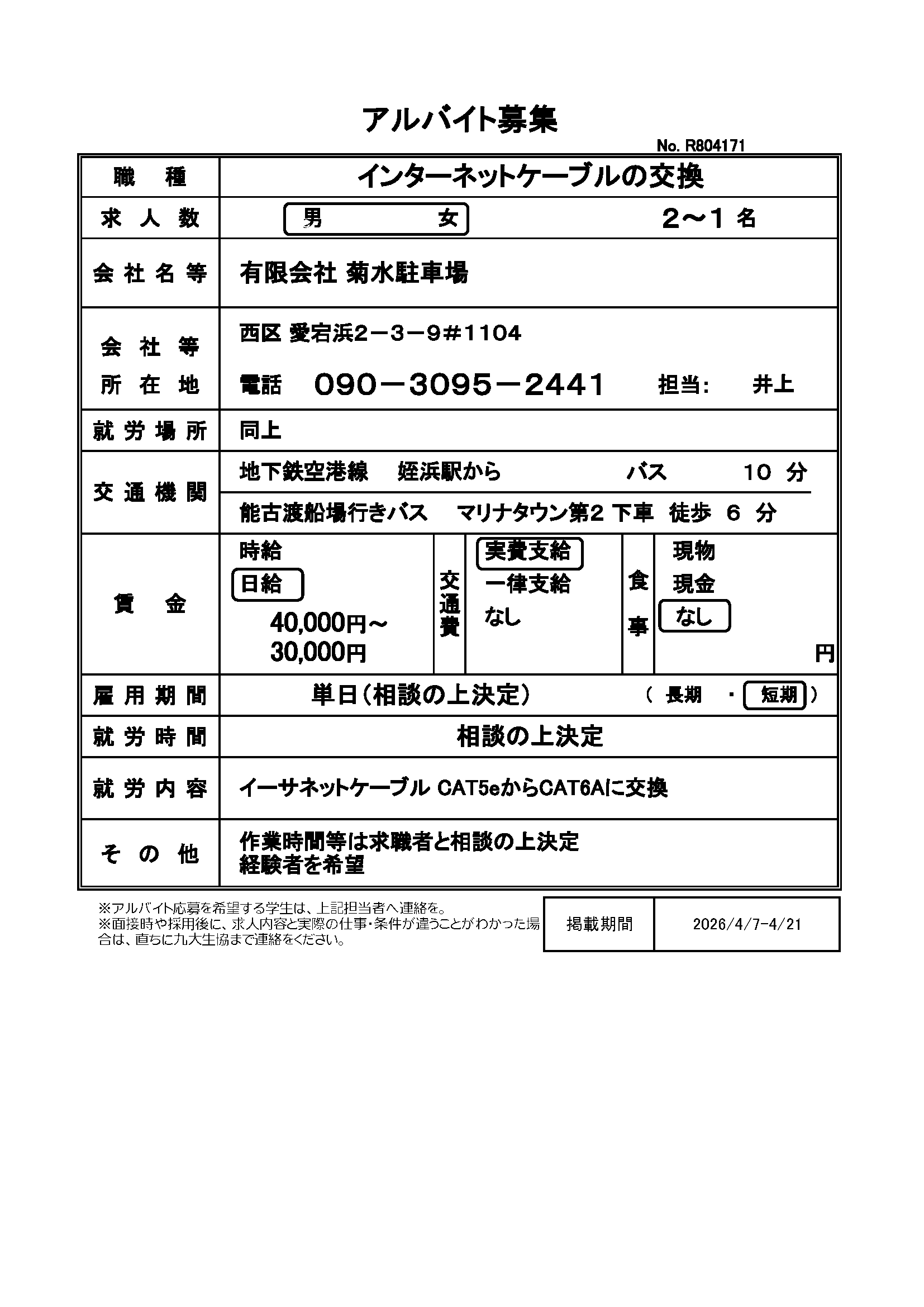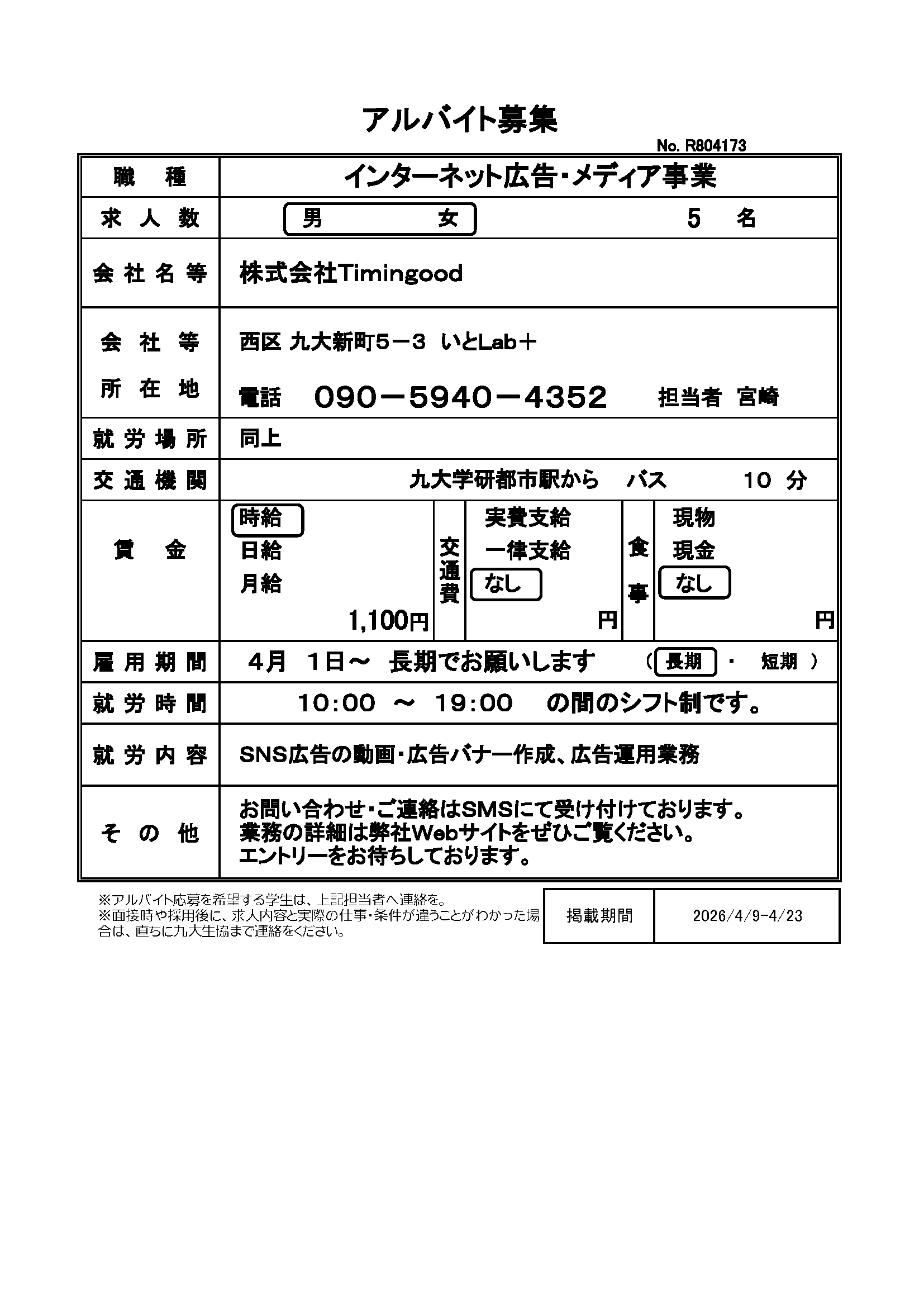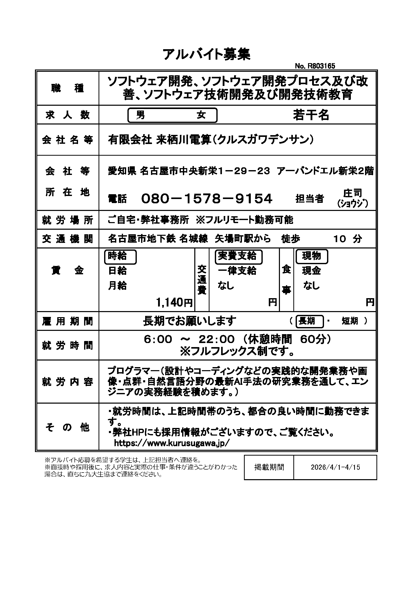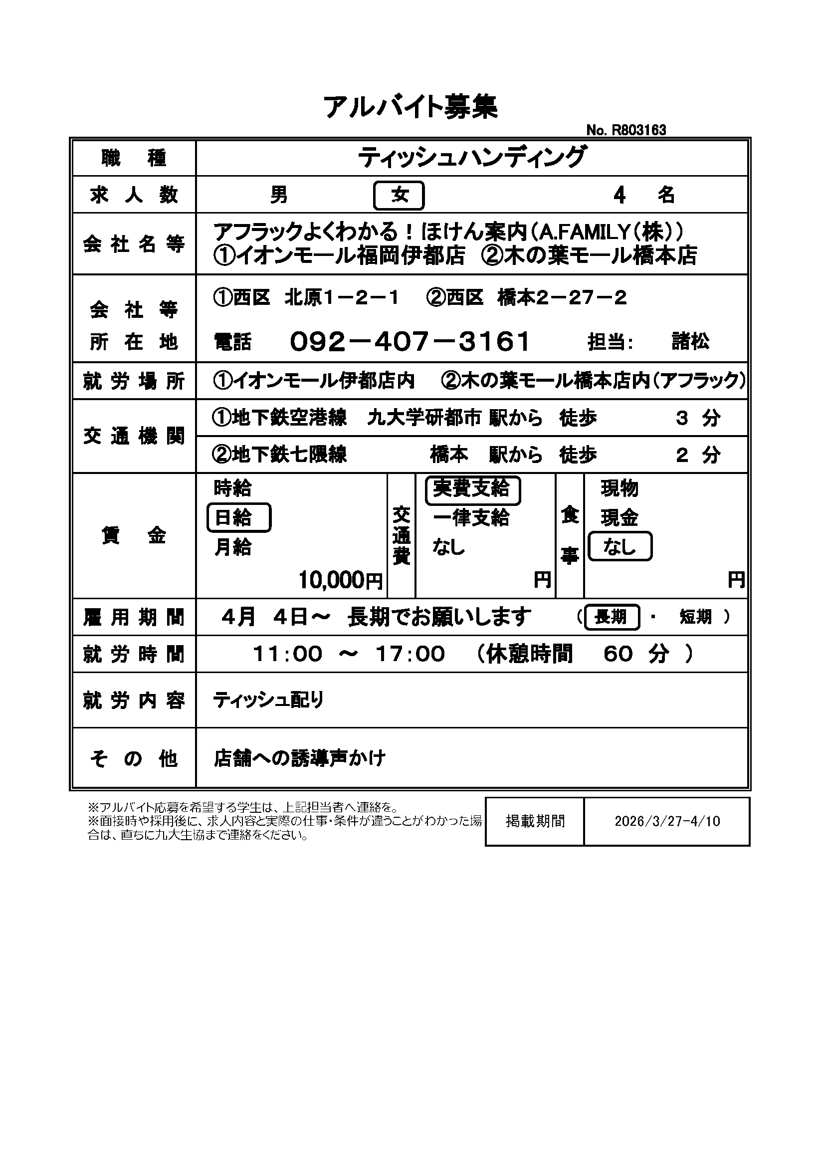 | R803173 | 4月1日~長期でお願いします | 2026.4.9 | |