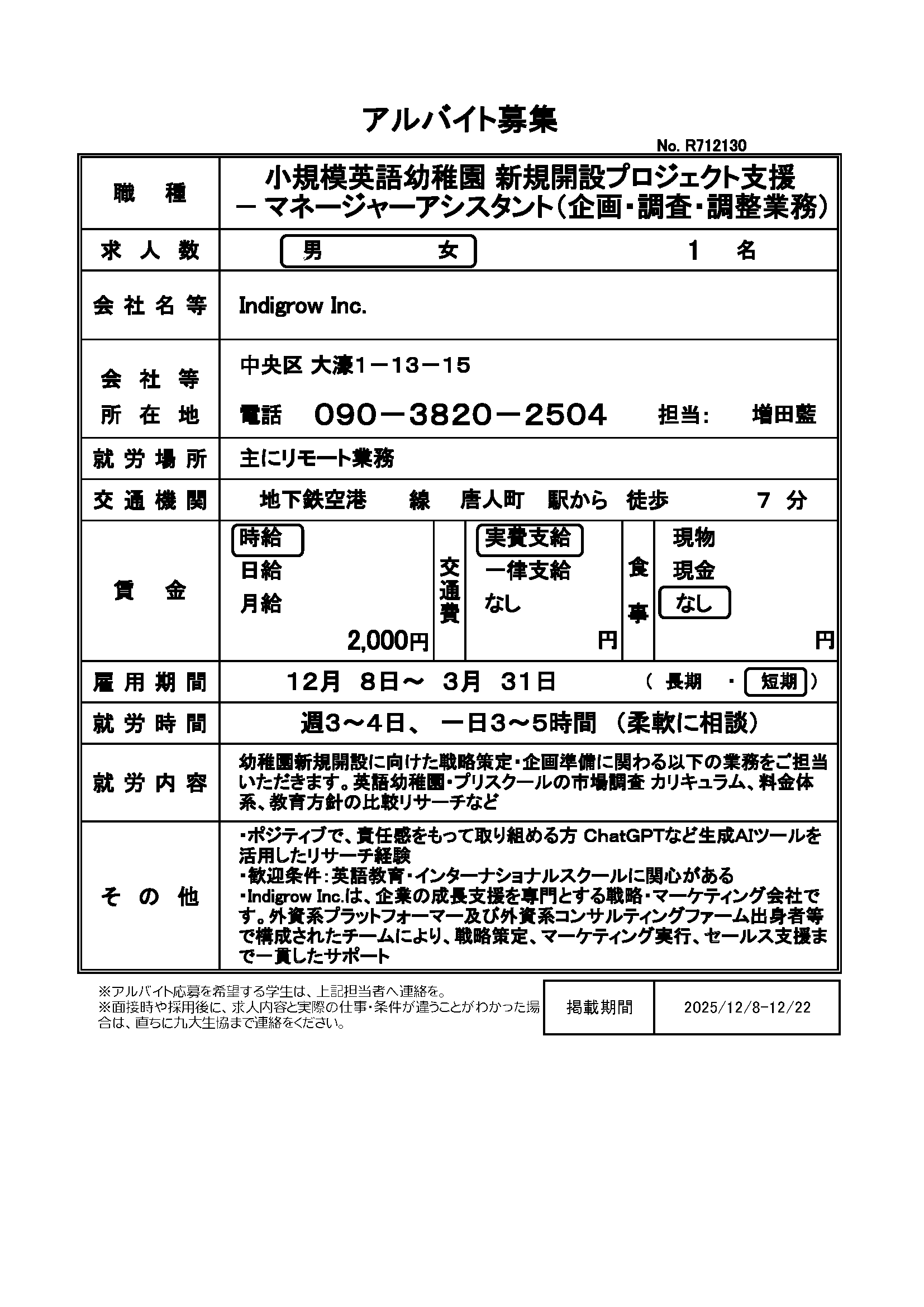 【短期】小規模英語幼稚園 新規開設プロジェクト支援
