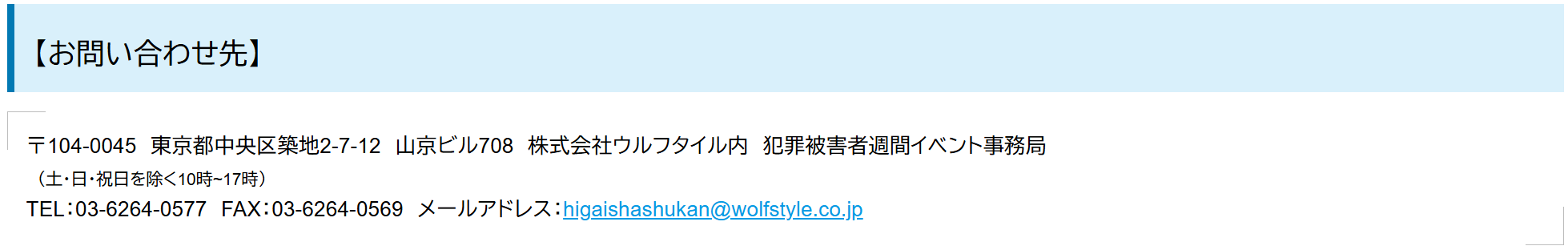 〒104-0045 東京都中央区築地2-7-12 山京ビル708 株式会社ウルフタイル内 犯罪被害者週間イベント事務局