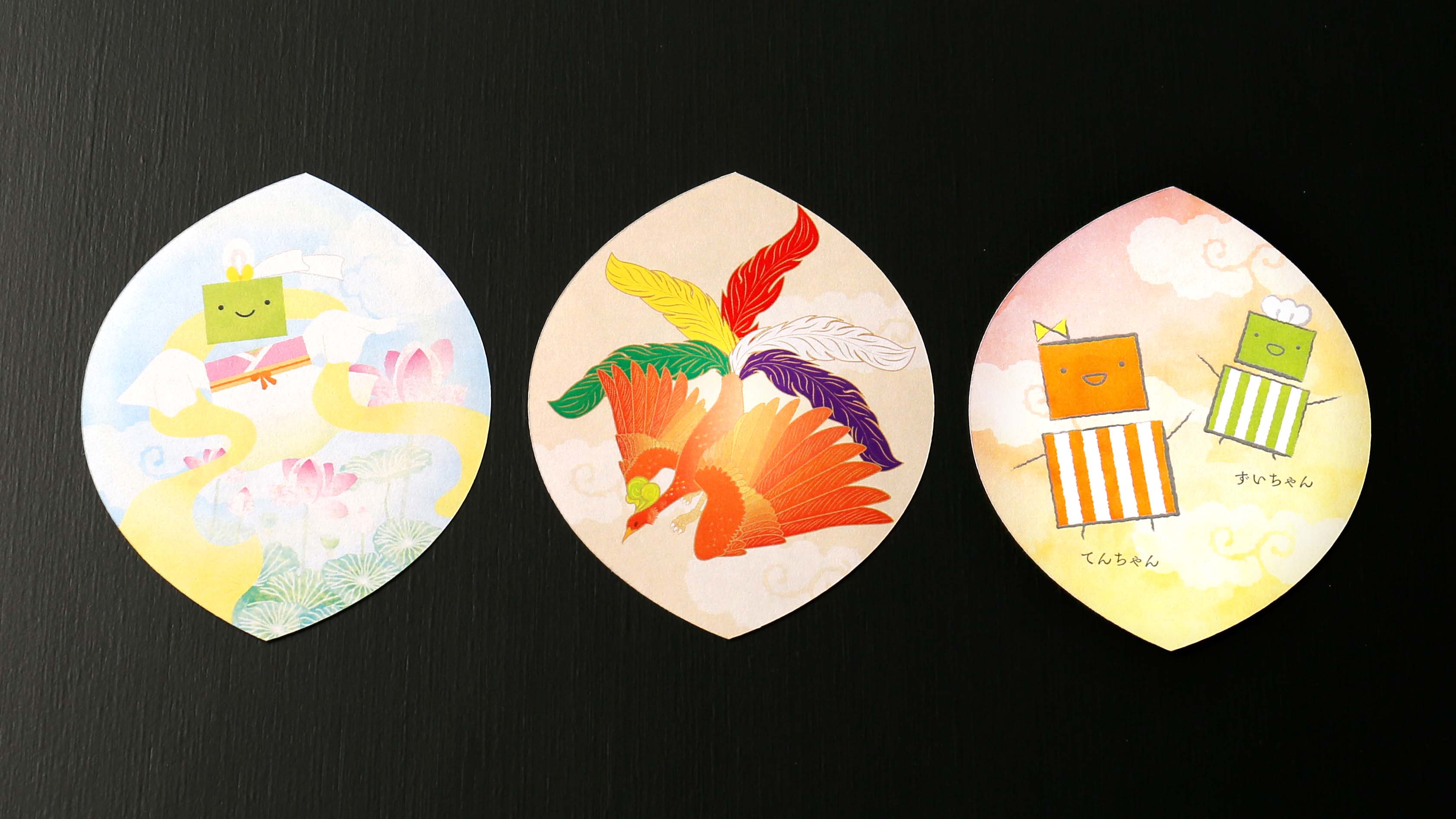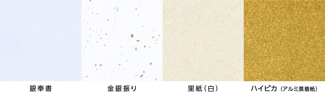 銀奉書:すっきりとした白さで比較的発色のよい和紙。表面は滑らかで、裏面はザラっとした手触りです。 金銀振り:表面は滑らかで、金銀の箔が散らされた和紙。裏面に箔は散らされておらず、ややザラっとした手触りです。 里紙(白):和紙の風合いを表現した洋紙。名前に「白」とありますが、薄いベージュくらいの色味です。表裏とも細かな凹凸を感じる素朴な風合い。 ハイピカ:和の雰囲気にもマッチする金箔を思わせるアルミ蒸着紙。梨地のような質感で、荘厳な印象に仕上がります。裏面は白です。 ※ご案内している上記の用紙以外をご希望の場合は、別途ご相談ください。