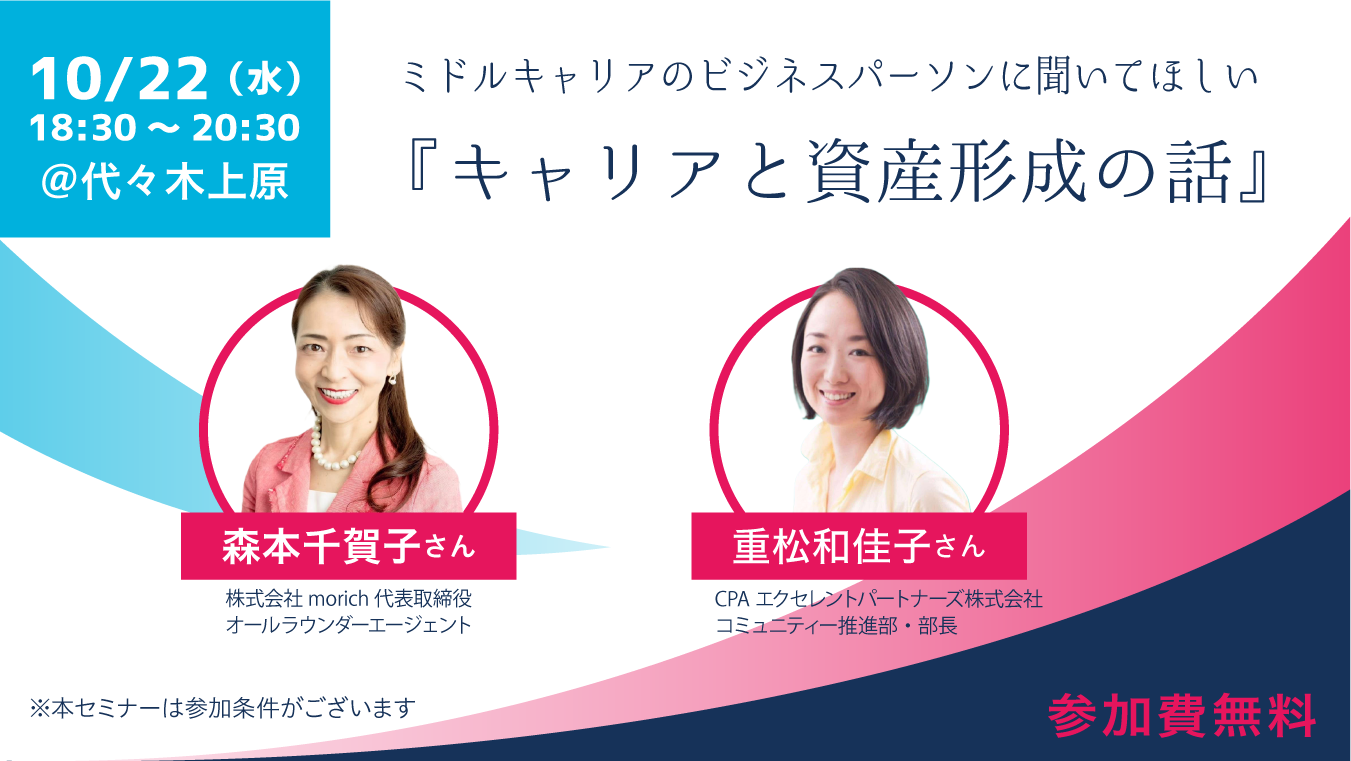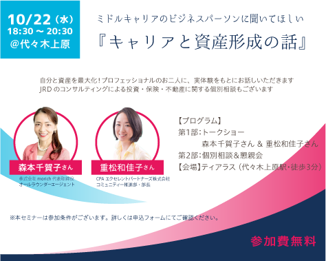 自分も「資産」の一部ととらえてキャリア形成を交えた「資産」を最大化するポイントを人材・転職のプロ 森本千賀子さん と、保険・資産運用のプロ 重松和佳子さん が、実体験をもとに本音で語ります。